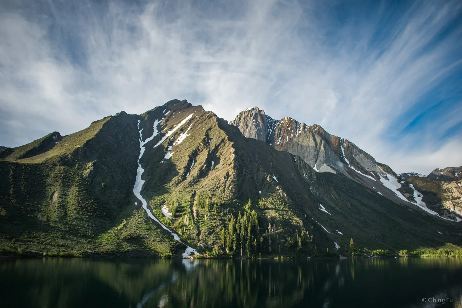 People are not misleading when they describe the scenery as dramatic. Convict Lake is encircled by the towering Sherwin Range of the Sierra Nevada. The most eye-catching peak is Laurel Mountain, standing broadly above the lake. To the south are Mt. Morrison, and in front is Mono Jim Peak.