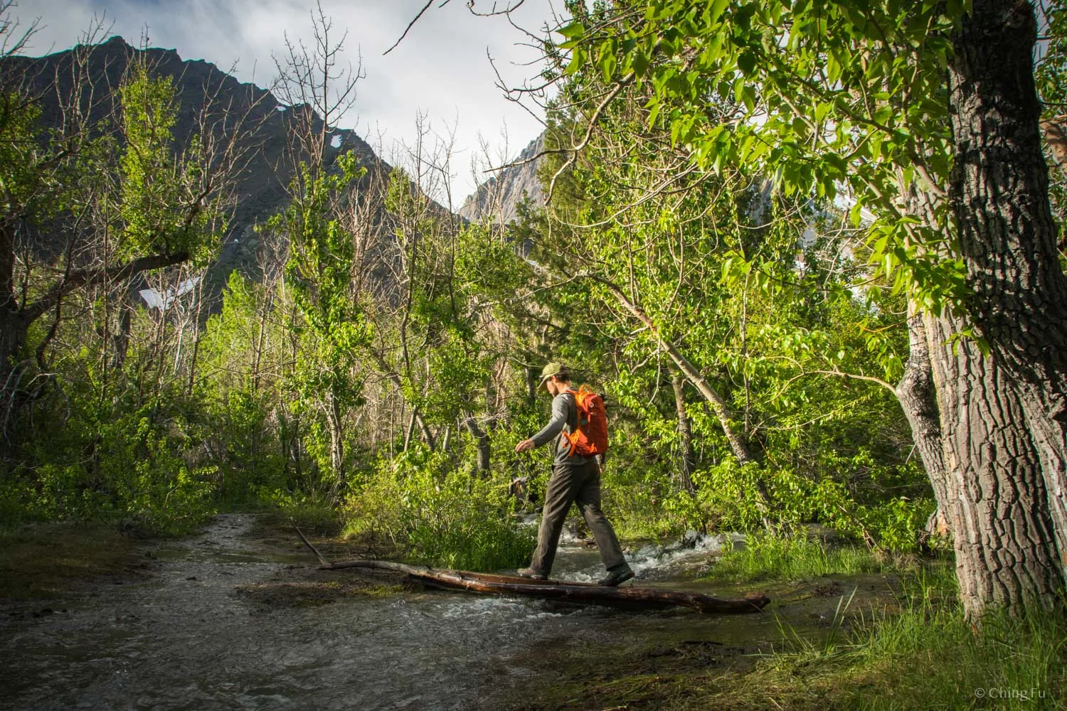 The length and ease of the trail was one reason I chose this hike, since I was still recovering from my Achilles surgery. Convict Lake Loop Trail is a fairly flat 2.5-mile hike that stays along the edge of the lake most of the way. But we did come across an unexpected section of the trail. Around the middle of the loop, the trail was washed away by the large amount of snowmelt (the Sierras had a big snow year). The weather had been really warm (high 80s to low 90s) the days before our hike, so the creek was at full-blast. This meant we had to either get our feet wet (not a big deal) or walk across two makeshift “bridges” (also not a big deal). In return, we got to experience the boardwalk section of the hike with snowmelt rushing underneath our feet. That was fantastic.