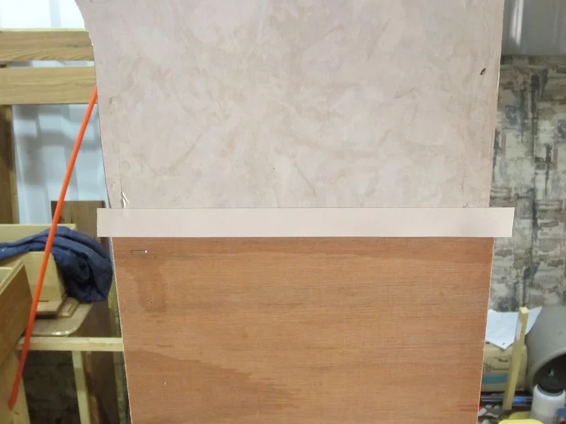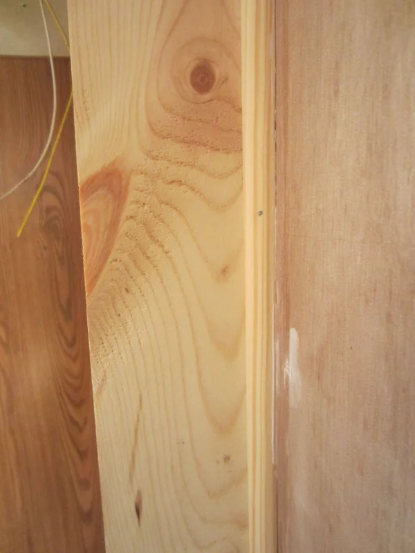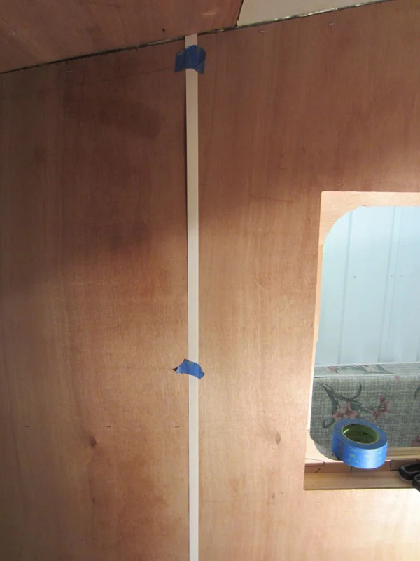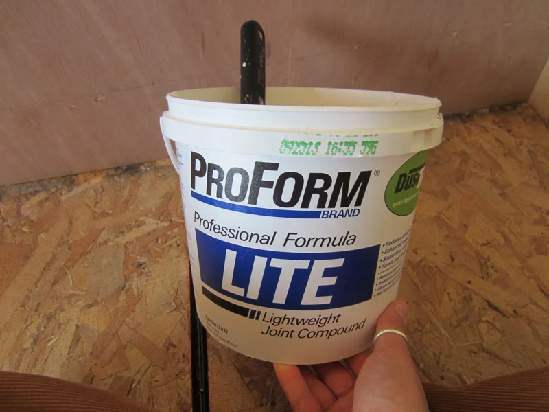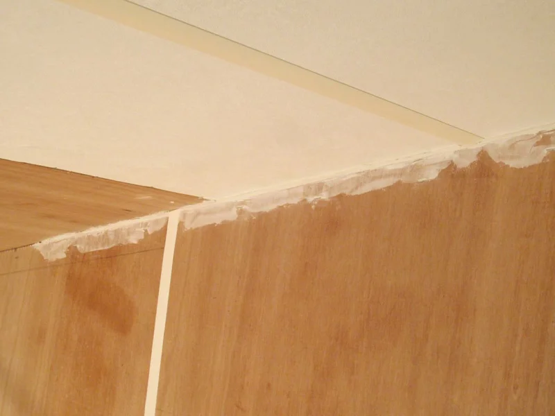 The bedroom walls have several seams that had to be taped. Since we had to install floor to ceiling length walls, there are seams at the ceiling and floor that needed to be taped. We couldn't cut the pieces of luan to be flush with the ceiling. This created a larger gap than we wanted up at the ceiling. We had to cover the gap with joint compound (photo on the right) before putting the tape on.
