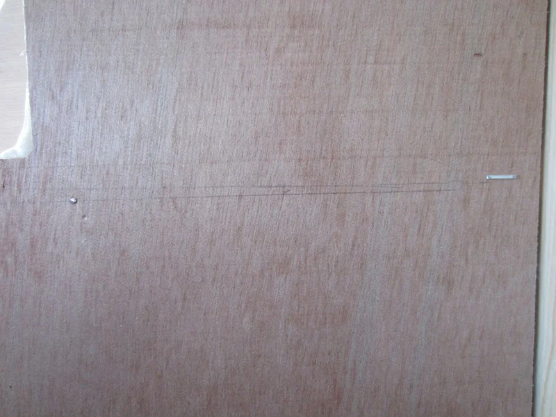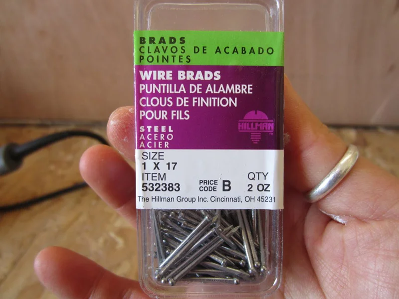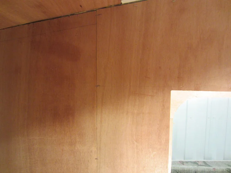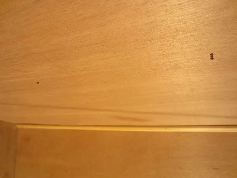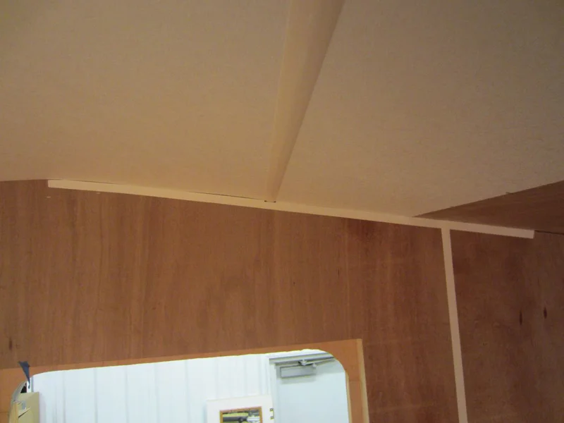 We covered the ceiling seam by the front bedroom window with 3/4" round molding instead of the seam tape because it looked a lot better. We also realized that the brads we used to install the new ceiling luan pops out (like in photo below) if we stand on the beams on the roof that the brads are nailed into. So we re-nailed them into the ceiling and have to remember not to walk on those beams.