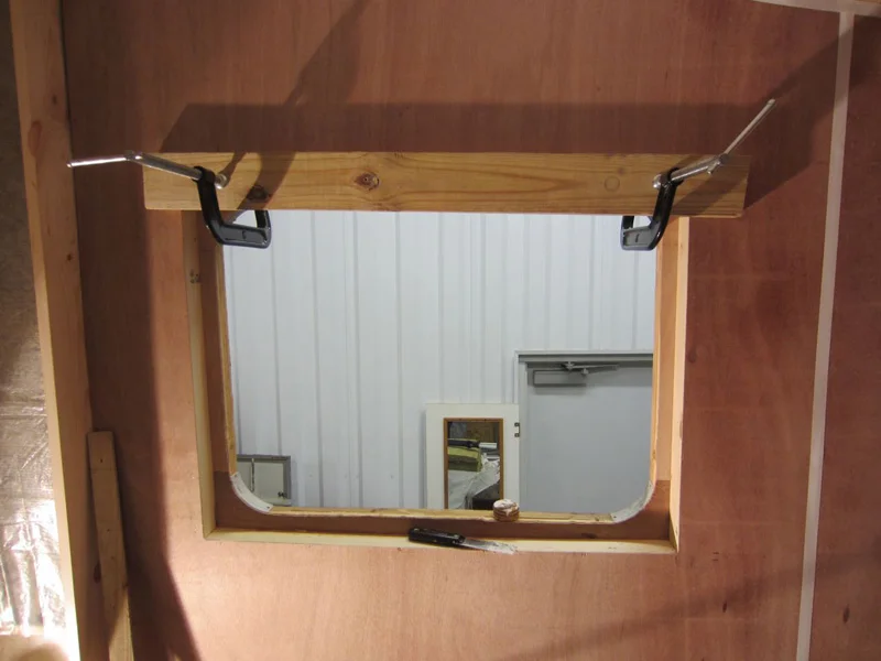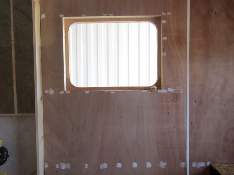 We had to find a clean way to attach the luan to the beams around the window instead of using staples, which doesn't leave a clean look. So we ended up using liquid nails to glue the luan to the window beams, then used a piece of wood to clamp it to the window to hold the luan tightly while the glue dried.