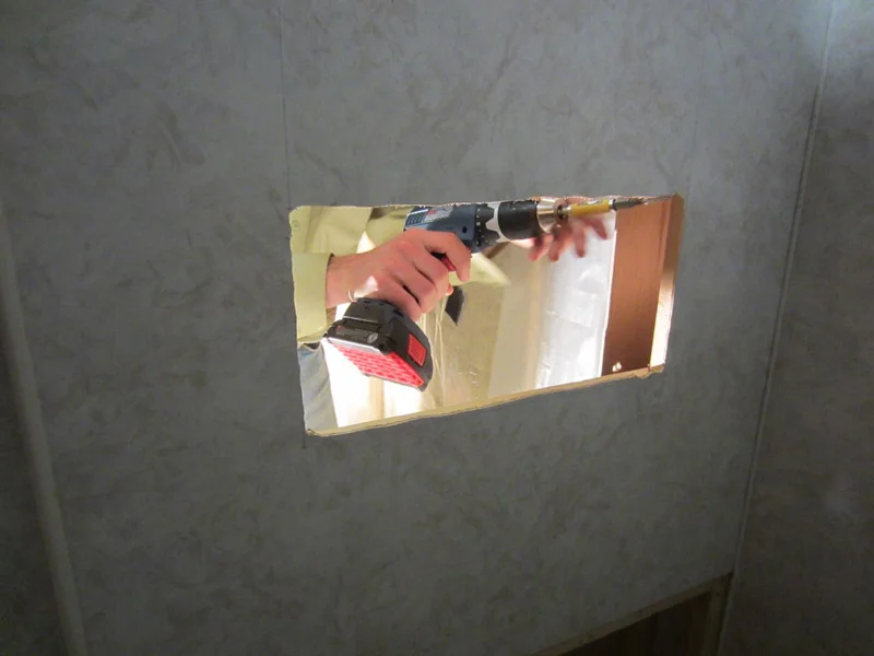 The distribution box (the distribution box has main power supply coming for the DC and AC, in RVs opposed to houses, and then it divides that power out to multiple circuits) used to be located under the fridge. But that wasn't a good location for us so we moved it from under the fridge into the bathroom. Two holes were cut out of the walls - one in the bathroom and the other on the opposite side of the wall where the shower surround will be. We had to cut a hole in the wall behind the shower so we could add framing to support the weight of the distribution box. Left photo: Jerud was installing the framing from the shower side; middle photo: hole in the shower wall and the back of the distribution box; and right photo: view of the face of the distribution box from inside the bathroom.