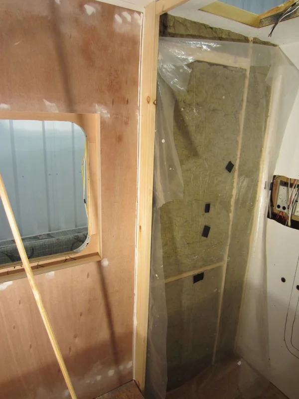 We installed a 2" x 6" piece of wood between where the shower surround is going to and the bedroom. (It's the lighter colored vertical piece of wood between the window hole and insulation). This piece of wood replaces the original divider wall we removed. We installed the 2" x 6" because we decided it'd help keep the shower curtain in place better and prevent water from the shower from spraying past the shower curtain.