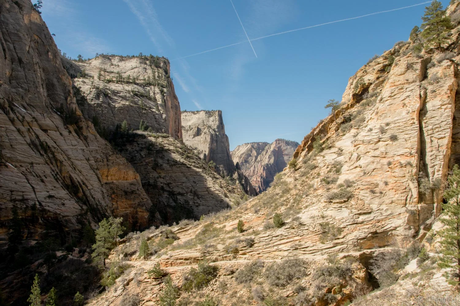 Over breakfast Dolly found out from a stranger that West Rim Trail was worth hiking and a good alternative to summiting Angels Landing. We agree. At the fork, instead of continuing right to reach the top of Angels Landing, we took the West Rim Trail on the left. This trail turns the corner to bring hikers to a view that Angels Landing doesn’t offer. The scenery here changes and although it isn’t the long range view of Zion Canyon, it’s a view worth seeing.