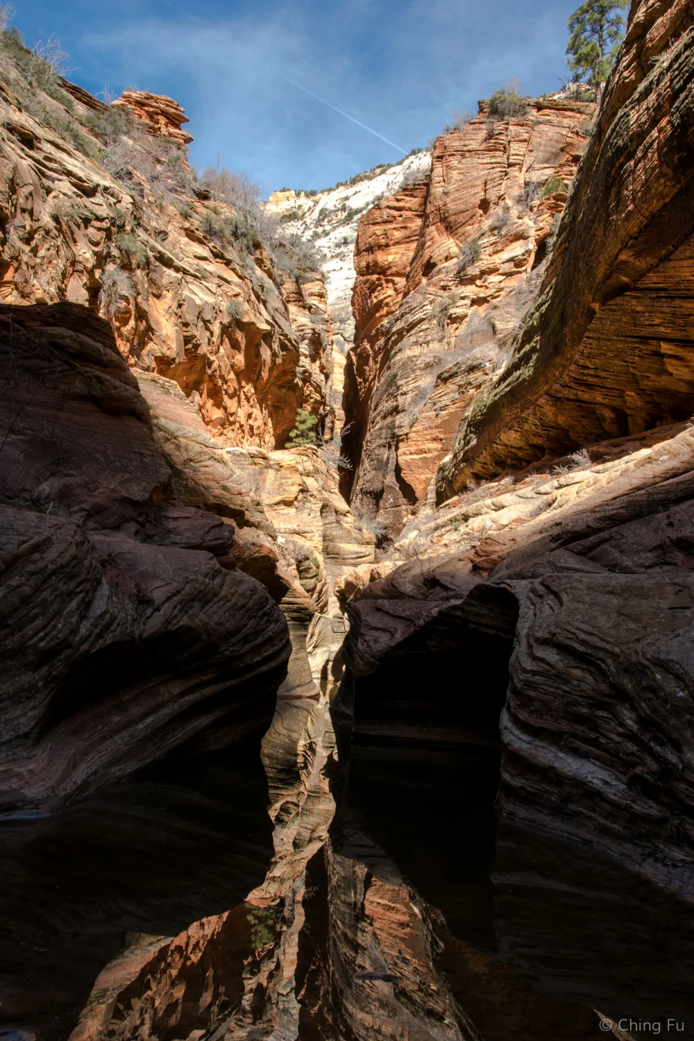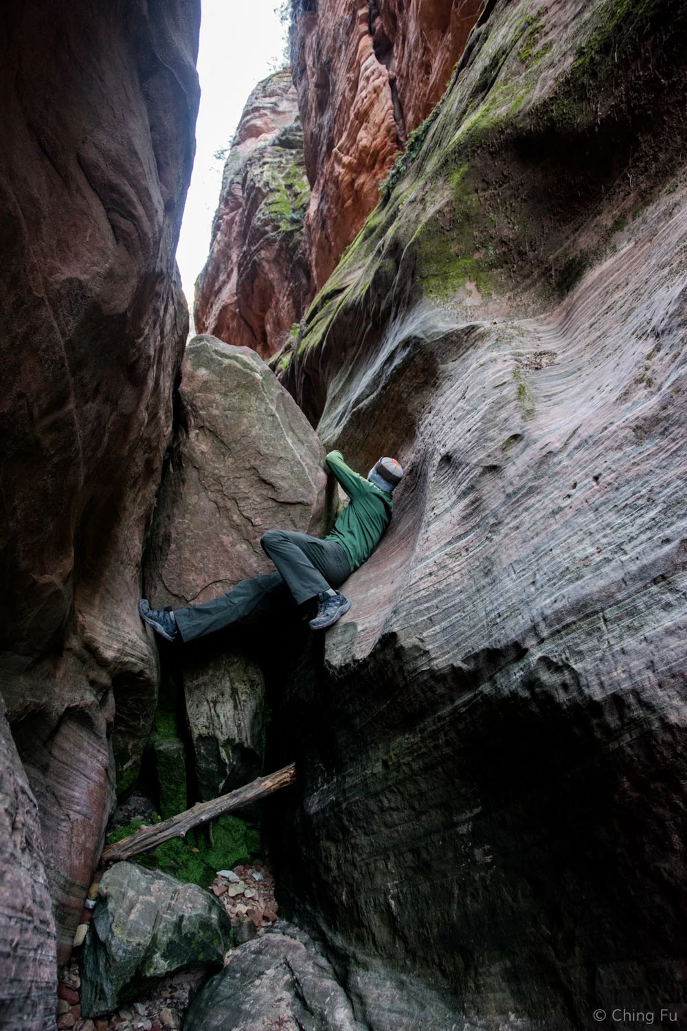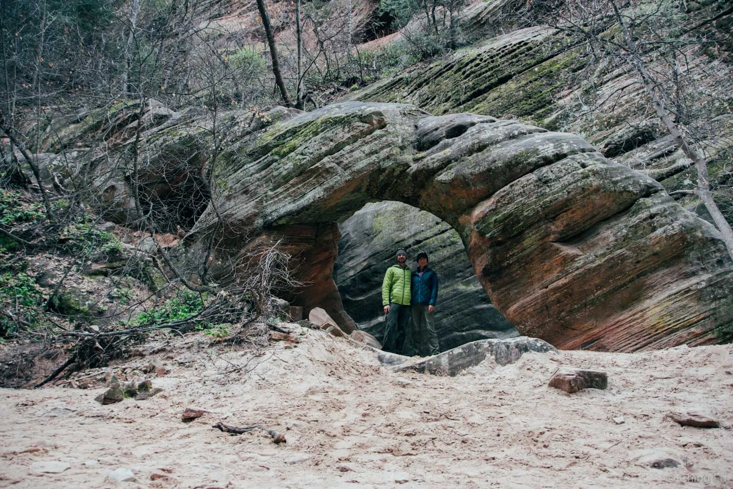 Jerud got to go on this hike with Dolly and Bill while I stayed home and watched the dogs. Then a week later Jerud and I went back to hike this together so I could experience it for myself. We really enjoyed the hike because it had a lot of variety and was very active – you have to use your hands and body a lot to scramble up and over rocks, tree trunks, and around pools of water. The canyon walls are also really cool looking. The beginning of the trail has chains along the cliff face, similar to Angels Landing (but only open on one side). It starts off on the same steep switchback trail as Observation Point before splitting off and going into a narrow canyon. Go as far as you are comfortable and able to. The only reason to keep pushing inwards past the baby arch is because you like scrambling challenges.