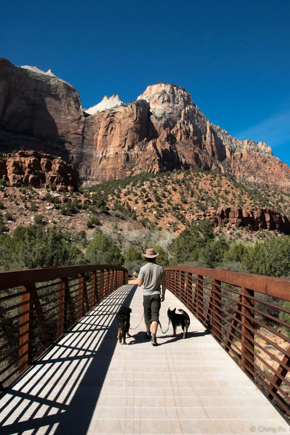 We hiked a short little section on the paved Pa’rus Trail, from Canyon Junction towards the main entrance, so the dogs could get out and stretch their legs. This is the only trail in the park that dogs are allowed on. Poop bags are even provided at the trail entrances. It’s a really pretty view from the river under the bridge part of the trail. On a hot day it would also be great to cool off in the Virgin River.