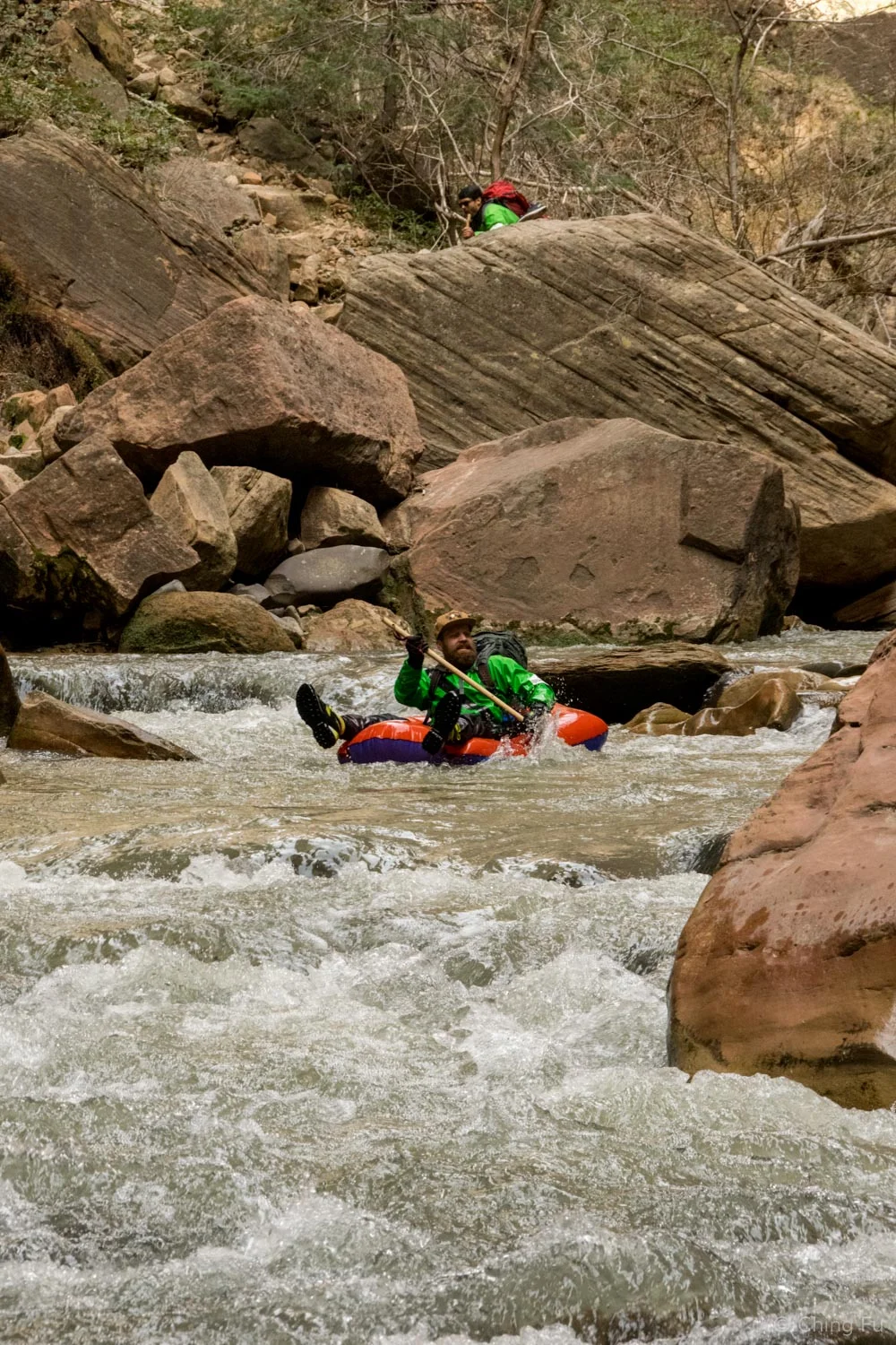 When we returned our dry suits, we found out from Zion Outfitter that we were about 0.5 mile from Big Springs and to get there we would have had to swim. Not an option with waders on.